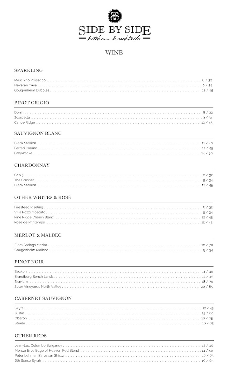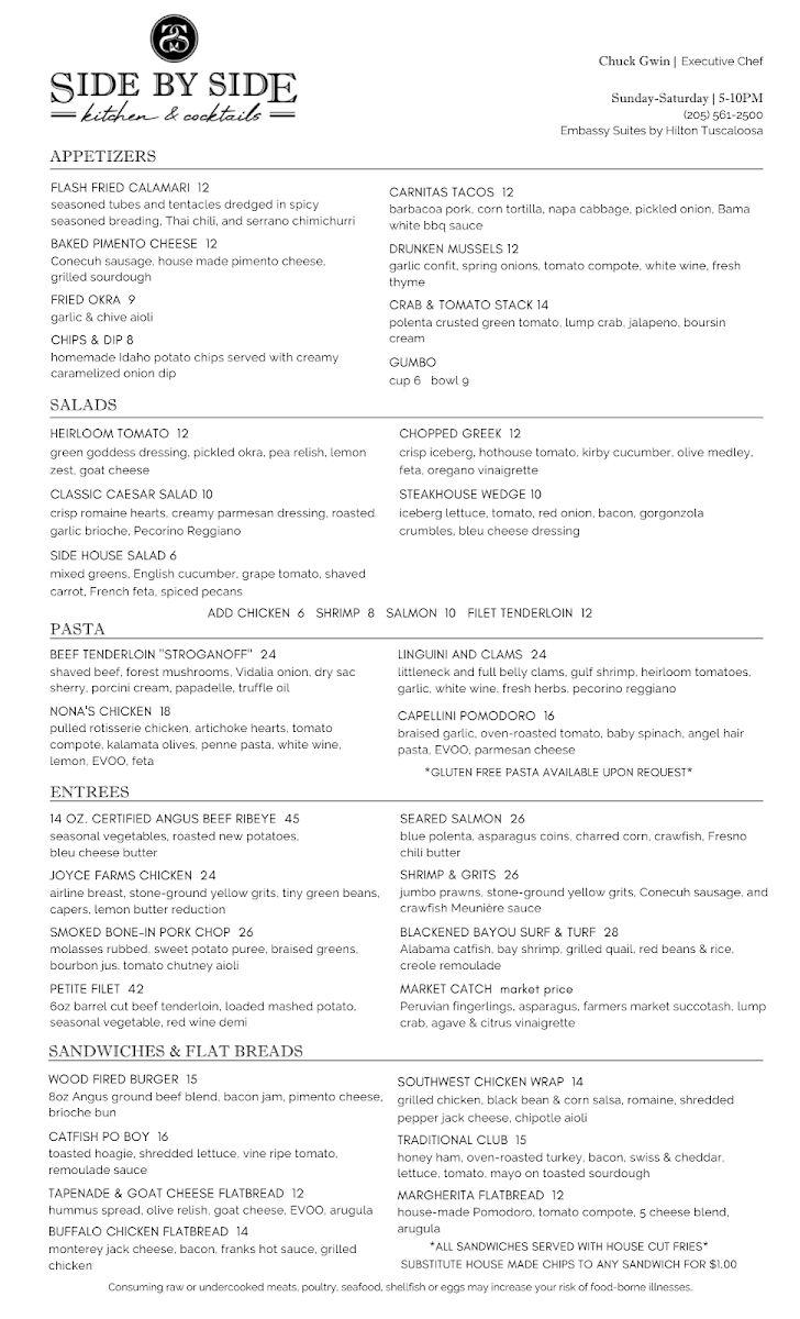 Welcome to Side by Side Kitchen & Cocktails, a culinary gem nestled in Tuscaloosa, AL, located at 2410 University Blvd. This restaurant promises an inviting atmosphere paired with a diverse menu that highlights local ingredients and innovative flavors.